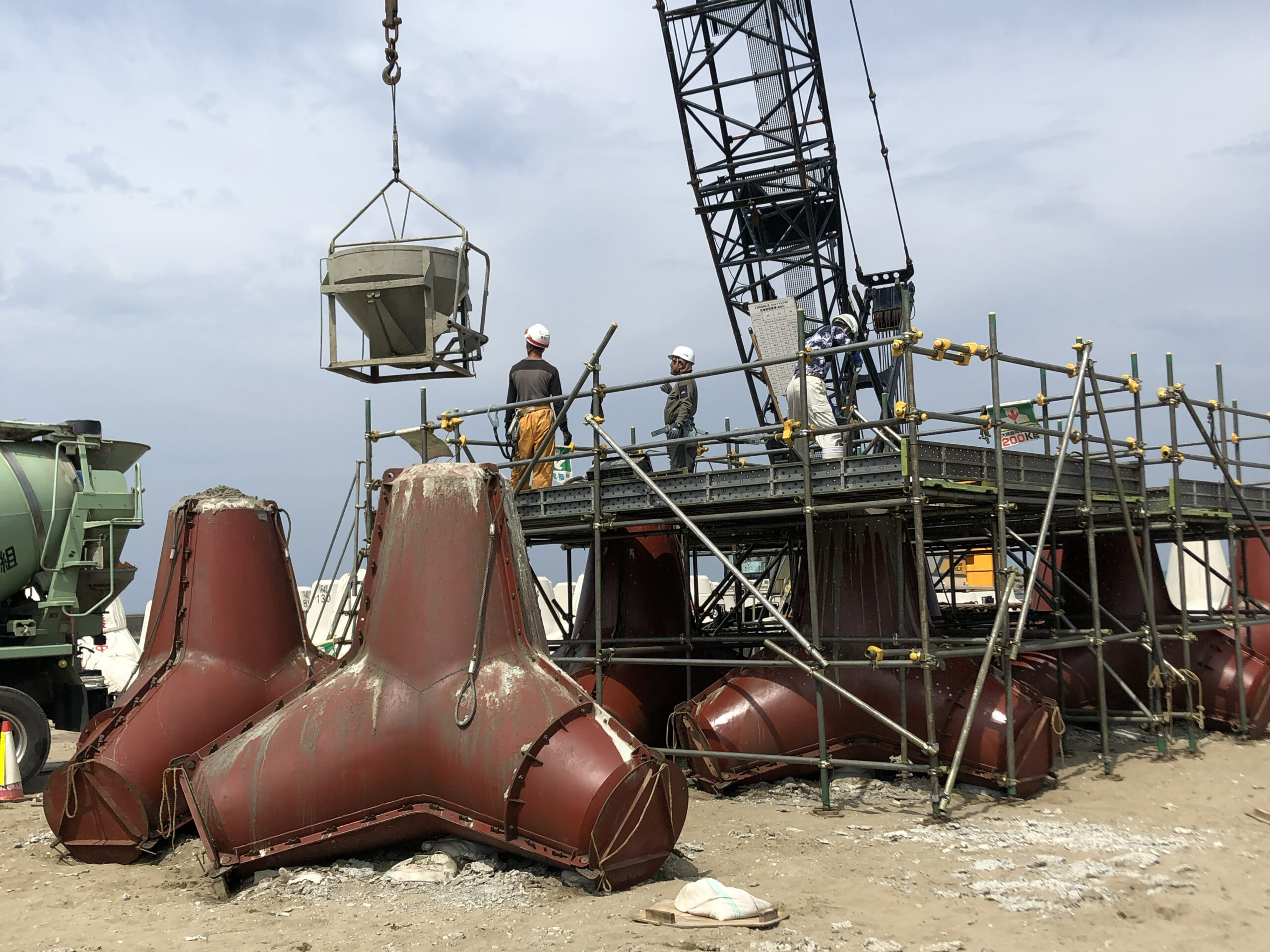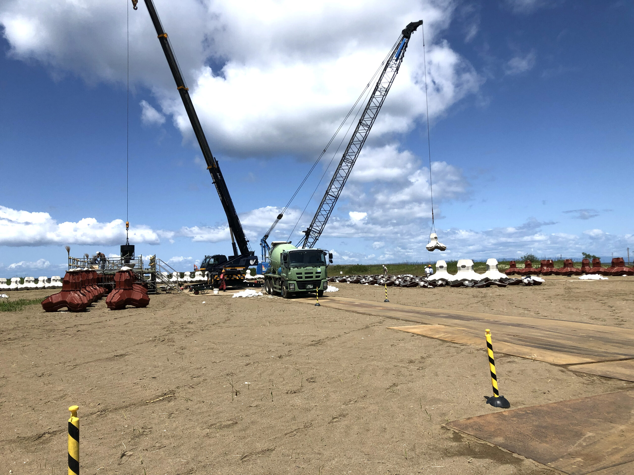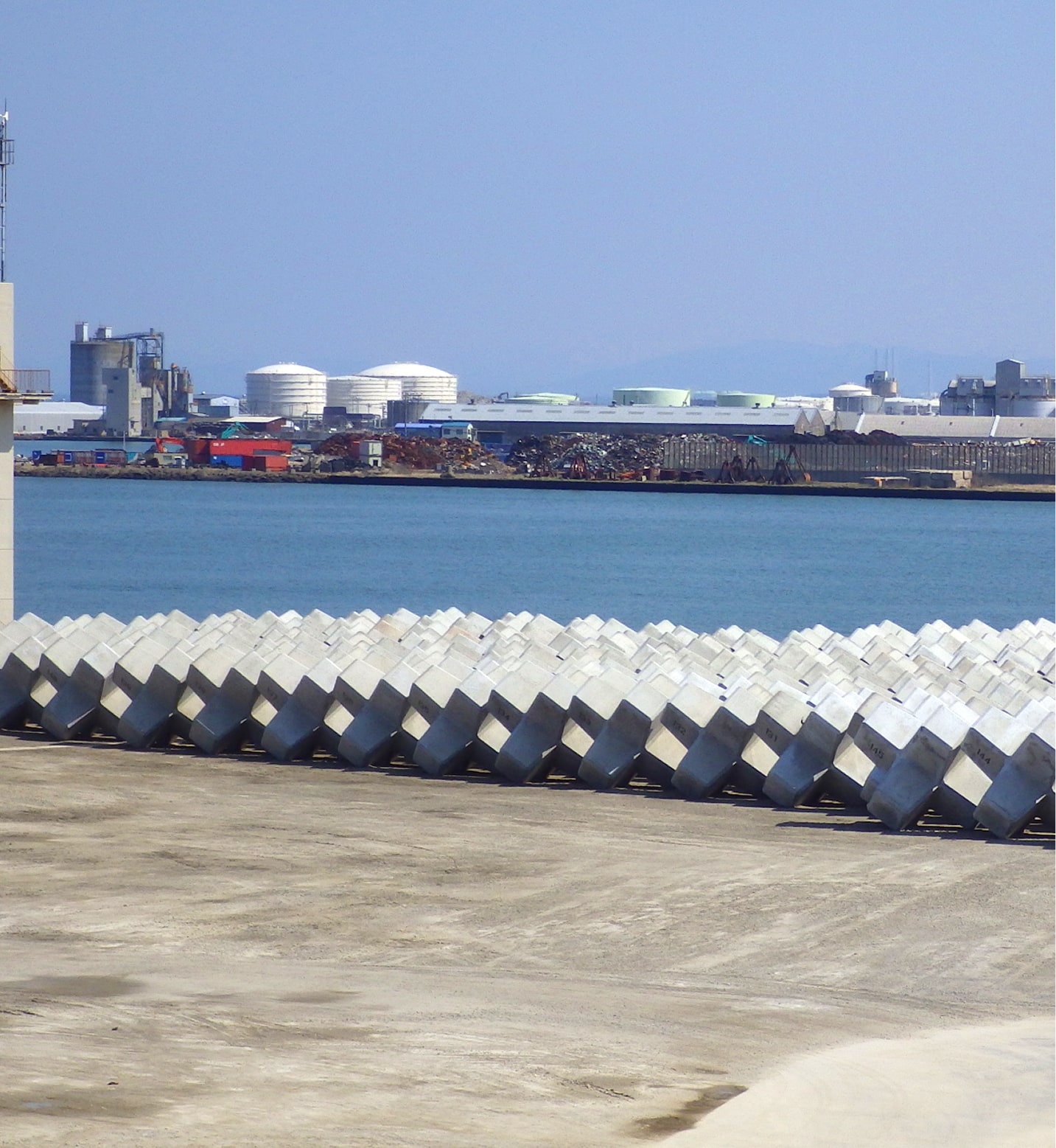 海岸保全施設とは、堤防・護岸、突堤、離岸堤、人工リーフ(潜堤)、消波工、砂浜等、海水の侵入又は海水による浸食を防ぐための施設。護岸や消波工による海岸線を防護する線的防護式から、近年は利用面や環境面も重視して、人工リーフや養浜、暖傾斜護岸等の複数の施設によって、波の力を分散させて受け止める面的防護式に変わって来ています。常に自然と共存し、海岸線河川護岸を守る工事をしています。