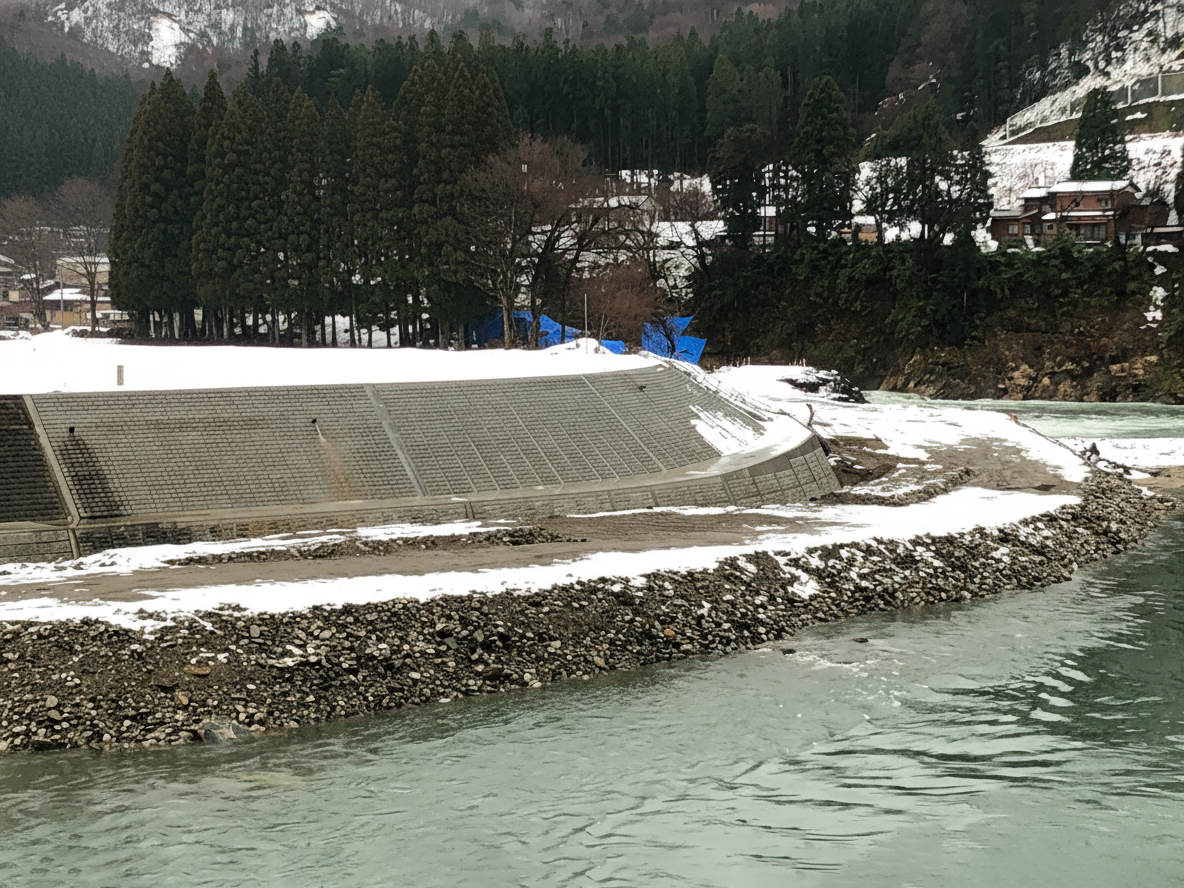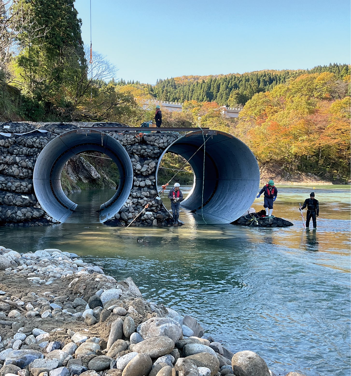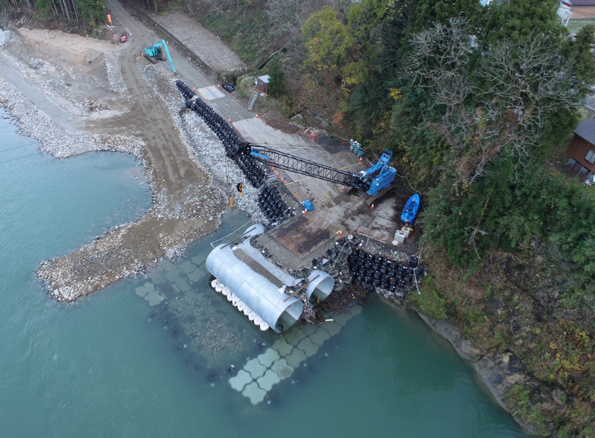 河川流域周辺地域を災害から守るため、洪水時における地下水の浸透を防ぐ矢板の打設や堤防の決壊を防ぐブロックを張り、河川機能を強化することを「護岸」工事といいます。近年の建設業界では、自然と共存した材料を使用することで景観にやさしい取り組みや、作業の効率化・高精度化をはかる「ICT施工」が導入されていますが、弊社も施工現場では積極的に「ICT施工強化」を推進しております。